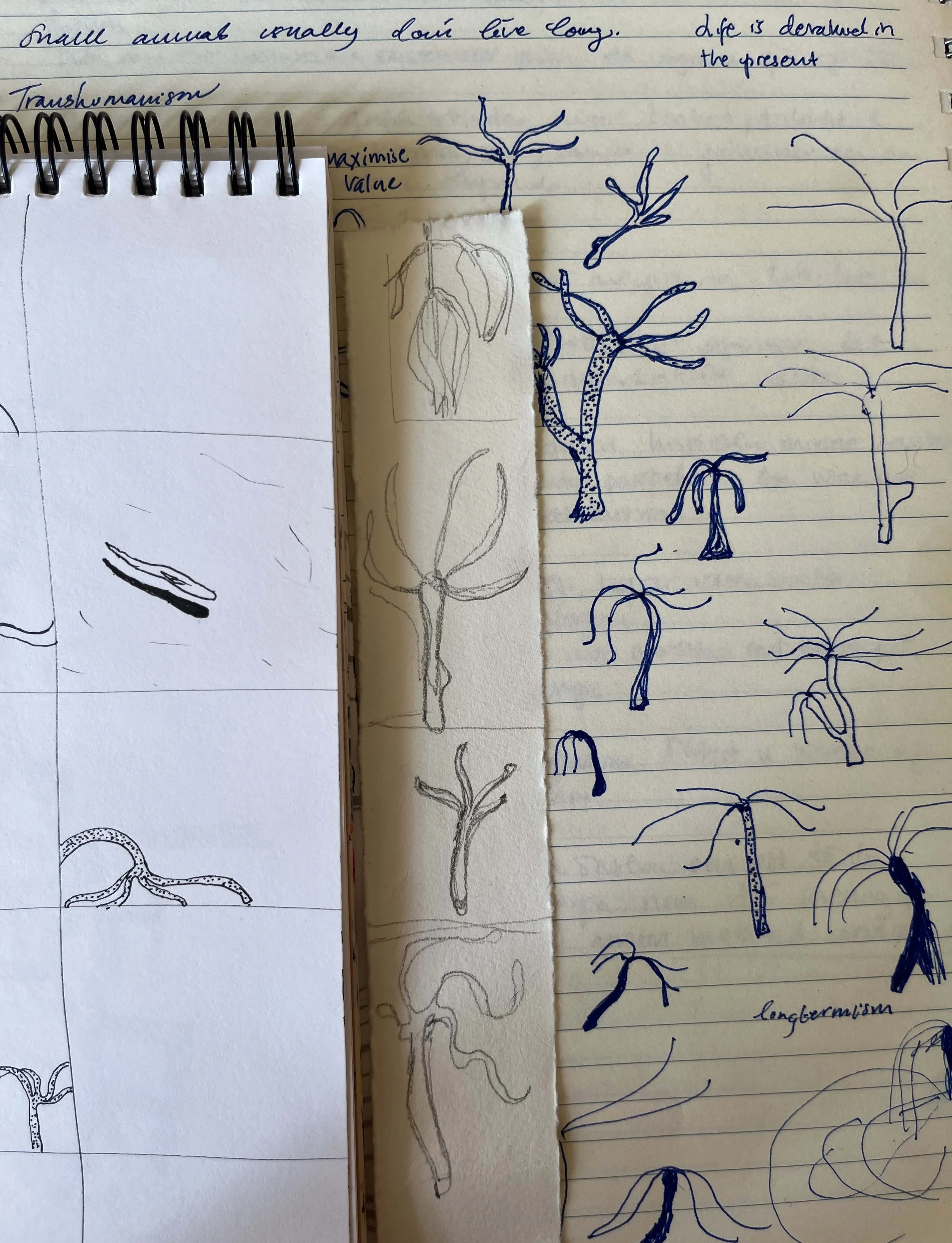 I'm reading De levande (The living) by the swedish philosopher Jonna Bornemark, the first book in her series Vrida världen (Tilting the World). From time to time, I pause to draw: roaches, hydras, small bodies in motion.